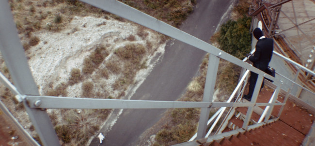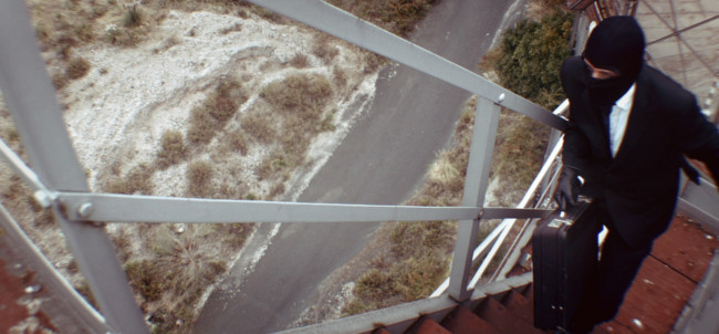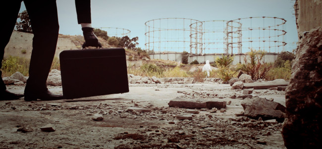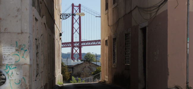Cut to: Exterior, close up of the image on the wall from earlier, then a wide shot revealing the whole scene: An alleyway with a red suspension bridge in the background. The protagonist is nowhere to be seen, in the foreground, the Antagonist – his briefcase standing next to him – is looking to where the Protagonist was before. Fade to black, end titles: LISBOA