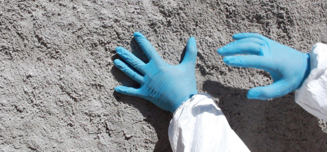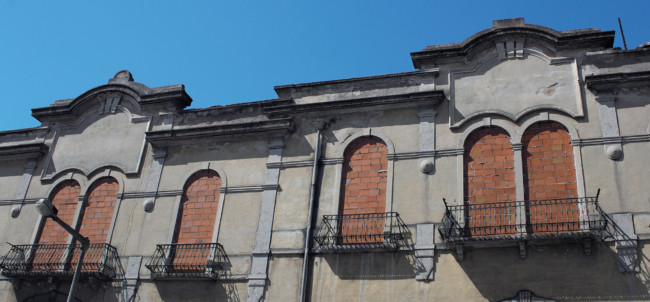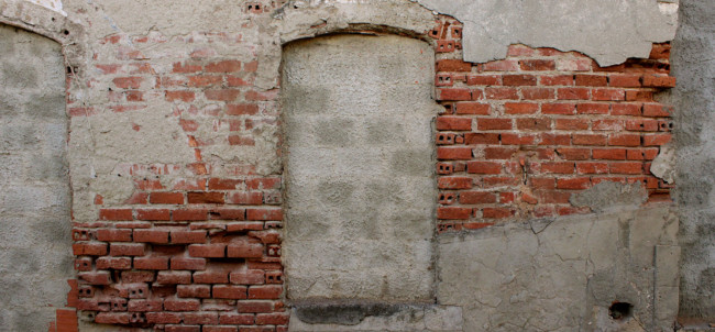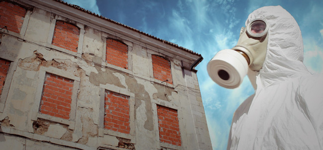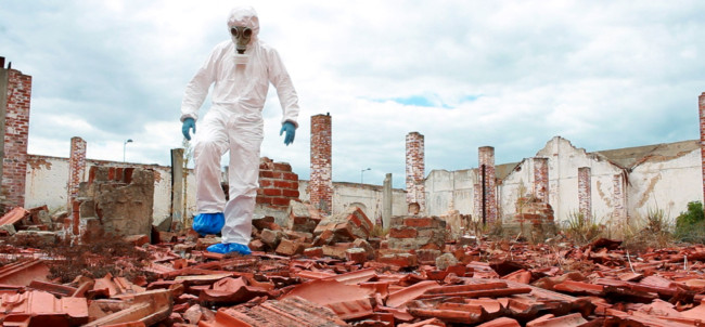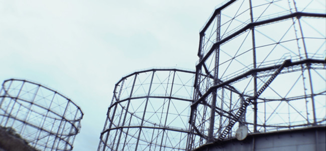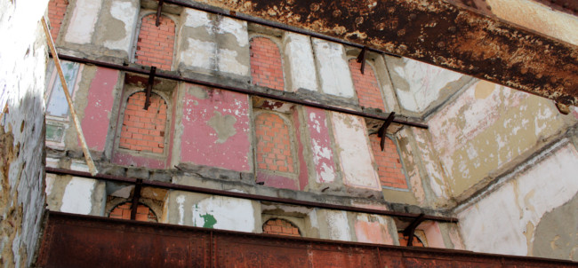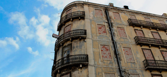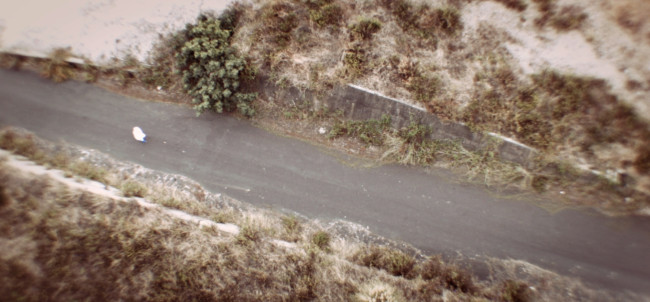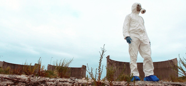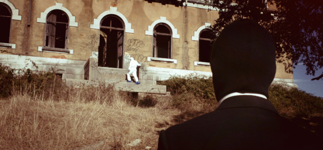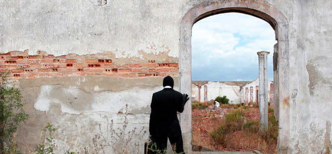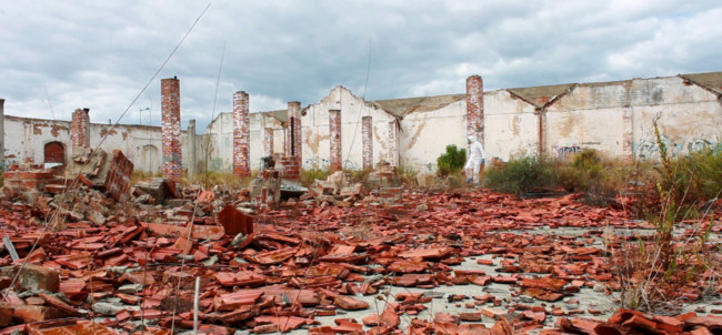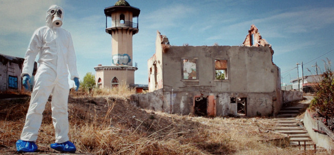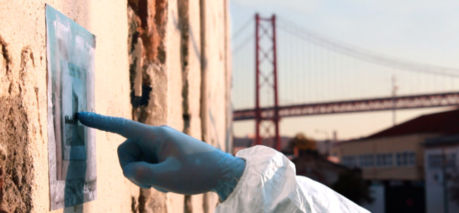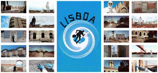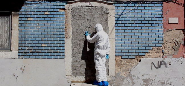 Lisboa’ centres around ‘The Protagonist’, who wears a white decontamination outfit, including surgical gloves and a gasmask. We follow him, as he explores a strange city devoid of humans made up of derelict houses, which have their windows and doors bricked up. On some walls of the city, there are images of other places, although it is not clear, if the Protagonist finds them or if he is placing them there.